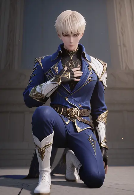 1boy, male focus, solo, brown eyes, blonde hair, black bodysuit, full armor, blue armor, pauldrons, gauntlets, armored boots,