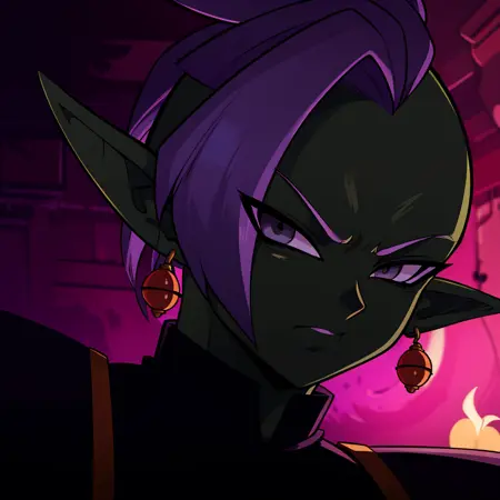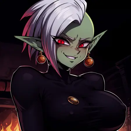 以下のタグを使用:色付き肌、緑色の肌、モヒカン、白髪、灰色の目、片耳垂らし、緑色の耳飾り(「尖った耳」も使用可ですが、時々耳が長くなりすぎるので、ご自由に選んでください)