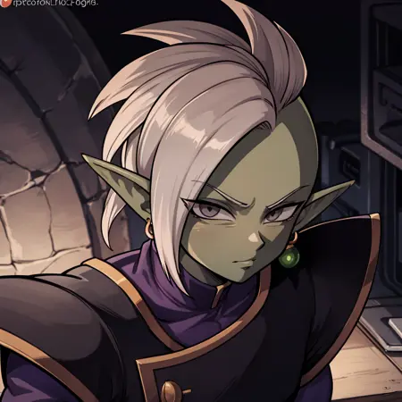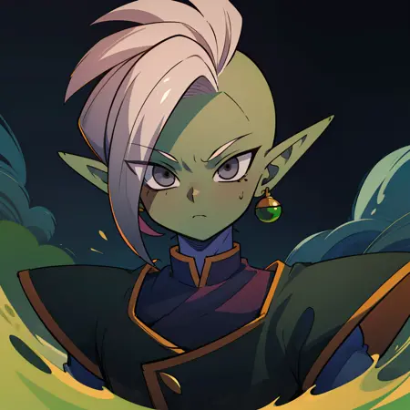 追加タグ: 色付き肌、緑色の肌、モヒカン、白髪、灰色の目、尖った耳、片耳垂らし、緑色の耳飾り、道着、白いブーツ