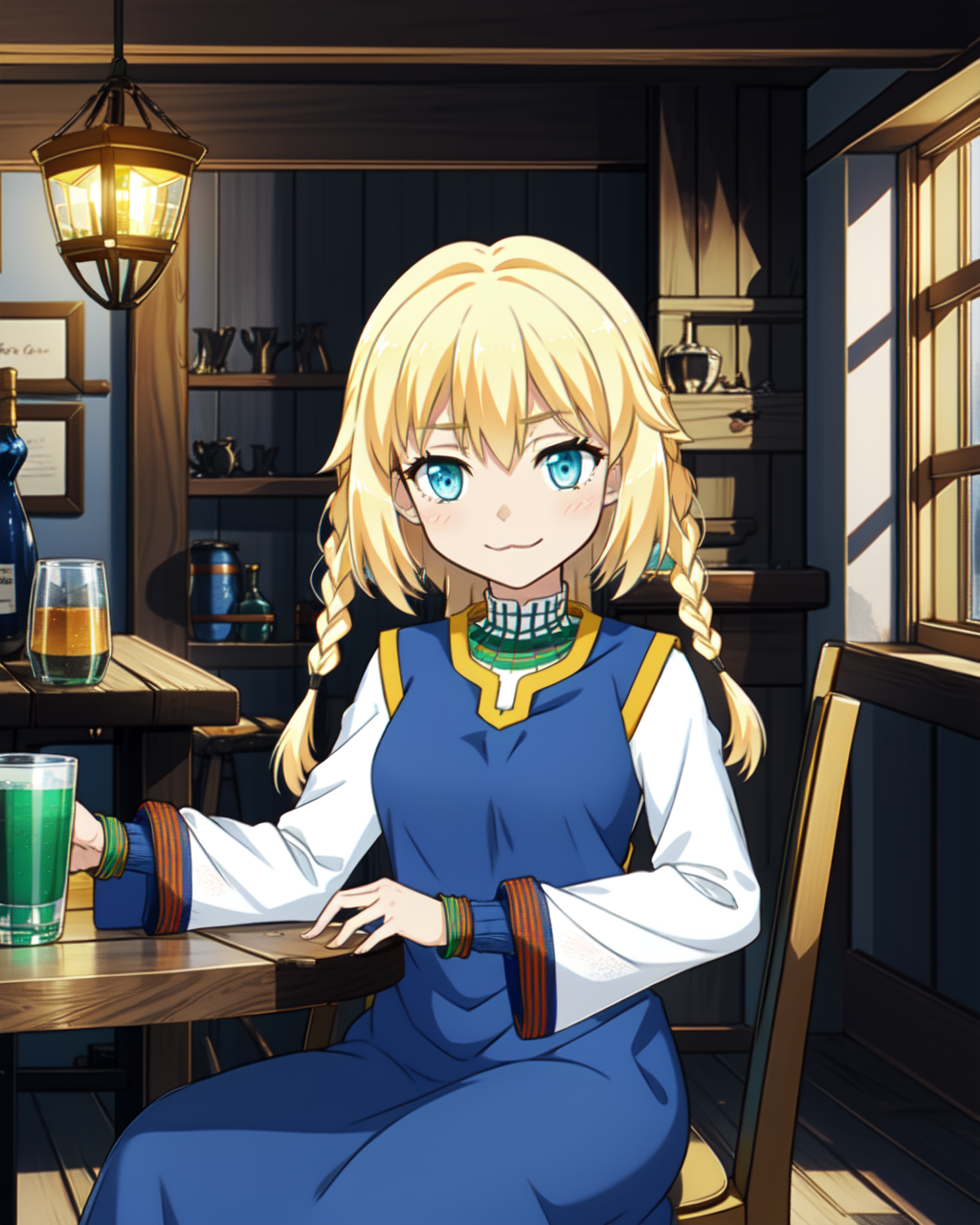 战士装束: mgrcolga,绿色领结,蓝色带白色毛皮斗篷,灰色上衣配金色镶边,长蓝色袖子,锁子甲,棕色束腰,黑色腰带,蓝色长裤