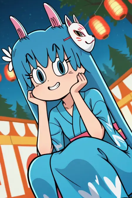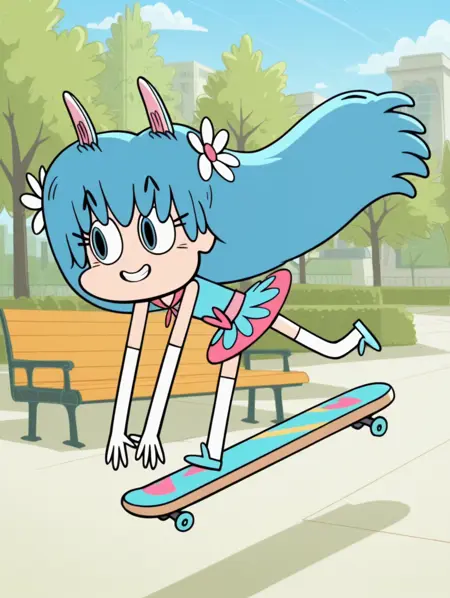 SukiZyN, 1girl, solo, blue eyes, blue hair, happy ,long hair, very long hair, animal ears, rabbit ears, gloves, white gloves, elbow gloves, thighhighs, hair ornament, hair flower, flower, skirt, footwear, full_body, parody