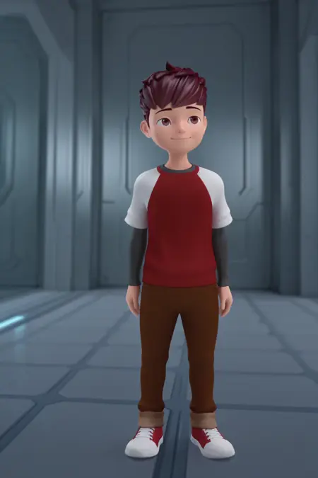 라글란 소매, 긴 소매 위에 짧은 소매, 갈색 바지, 빨간 스니커즈