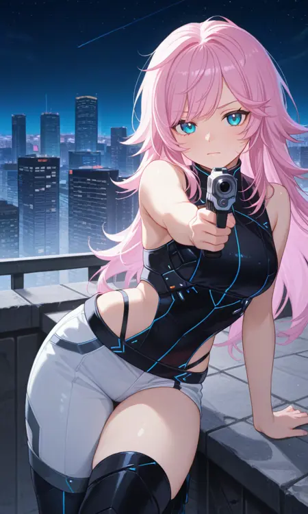 yuuhi riri, riri cyber, long hair, bare shoulders, black leotard, highleg, single pantsleg, white pants, black thigh boots- 부정 프롬프트: