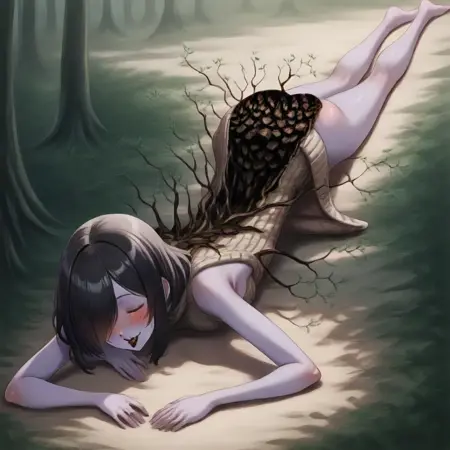 sk0gsr4smt, black hair, medium hair, hair over one eye, yellow eyes, black lips, purple skin, small breasts, bark on back, branches on back, leaves on branch,,