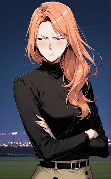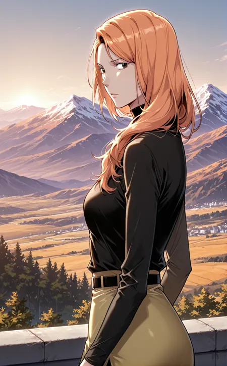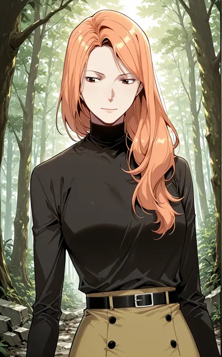 Chayuri, 1girl, solo, dark brown eyes, orange hair, long hair, wavy hair, side bangs, long bangs, hair over shoulder,
