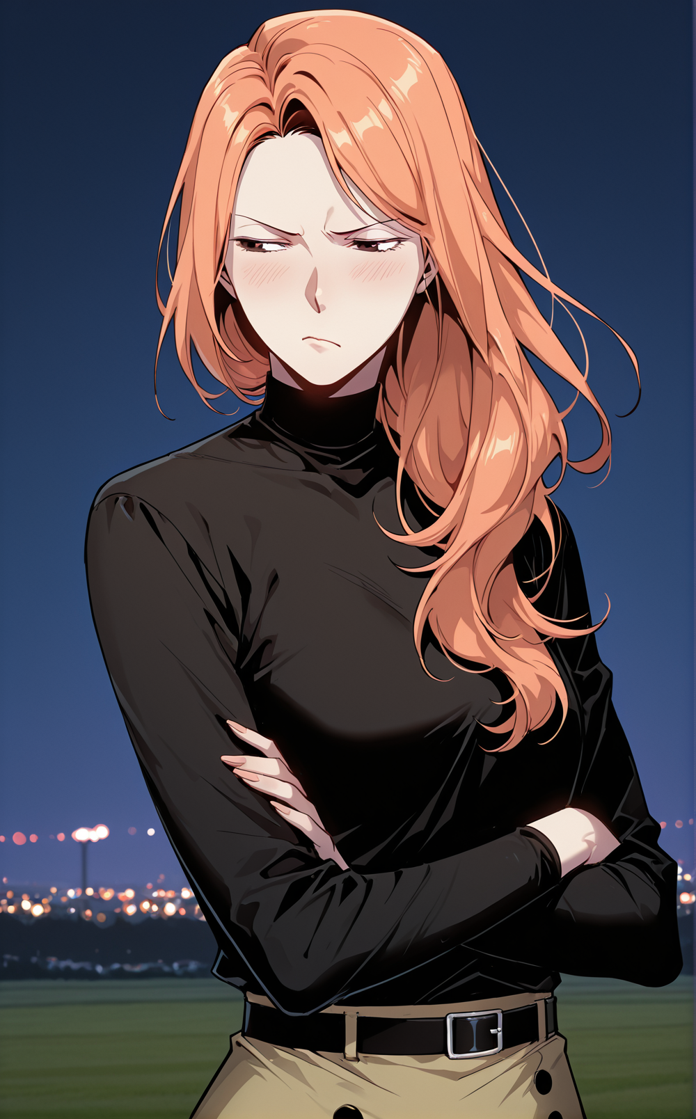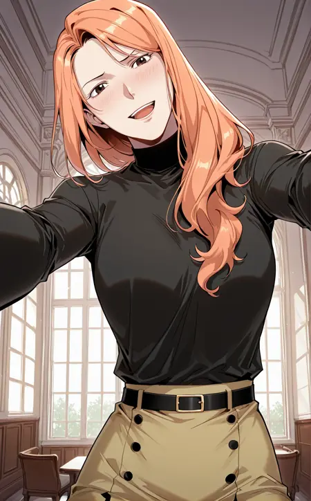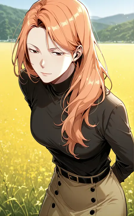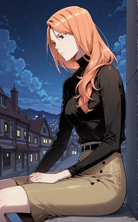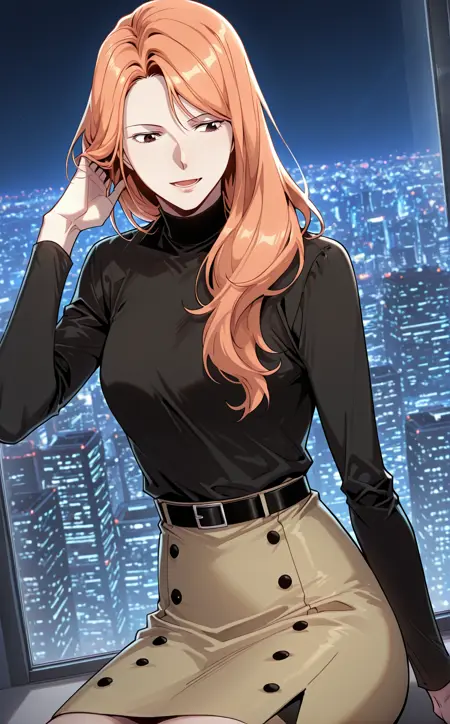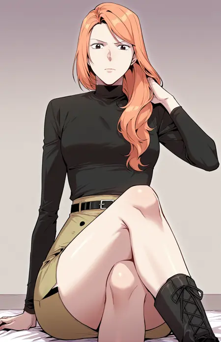 Chayuri_outfit, black shirt, turtleneck, long sleeves, tight shirt, black belt, dark yellow skirt, high waist skirt, buttoned skirt, ankle boots, black boots