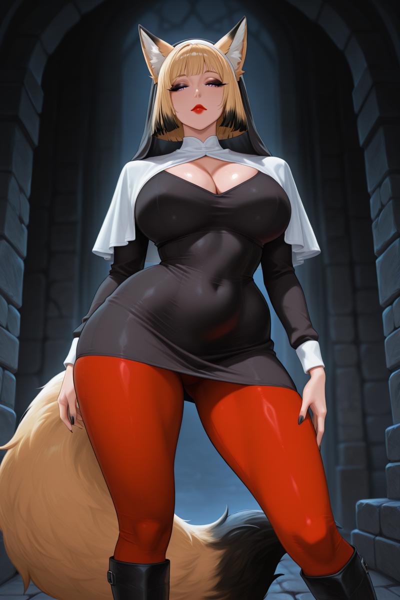 검은 베일, 흰색 카펠렛, 검은 아이섀도우, 빨간 립스틱, 검은 드레스, 짧은 드레스, 연필 드레스, 긴 소매, 가슴 노출 디자인, 빨간 레깅스, 무릎 길이 부츠,