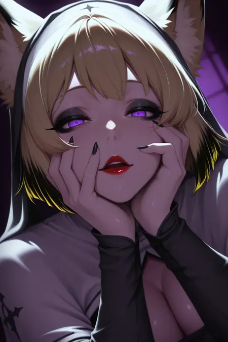 Mary_oc, 여우 소녀, 성숙한 여성, 창백한 피부, 보라색 눈, 금발 머리, 검은 머리, 색상 끝, 단발, 곡선이 아름다운 체형, 큰 가슴, 꼬리, 긴 손톱, 검은 손톱