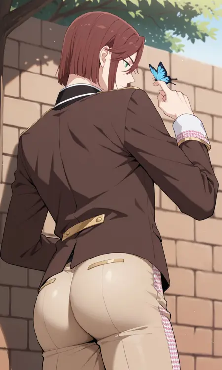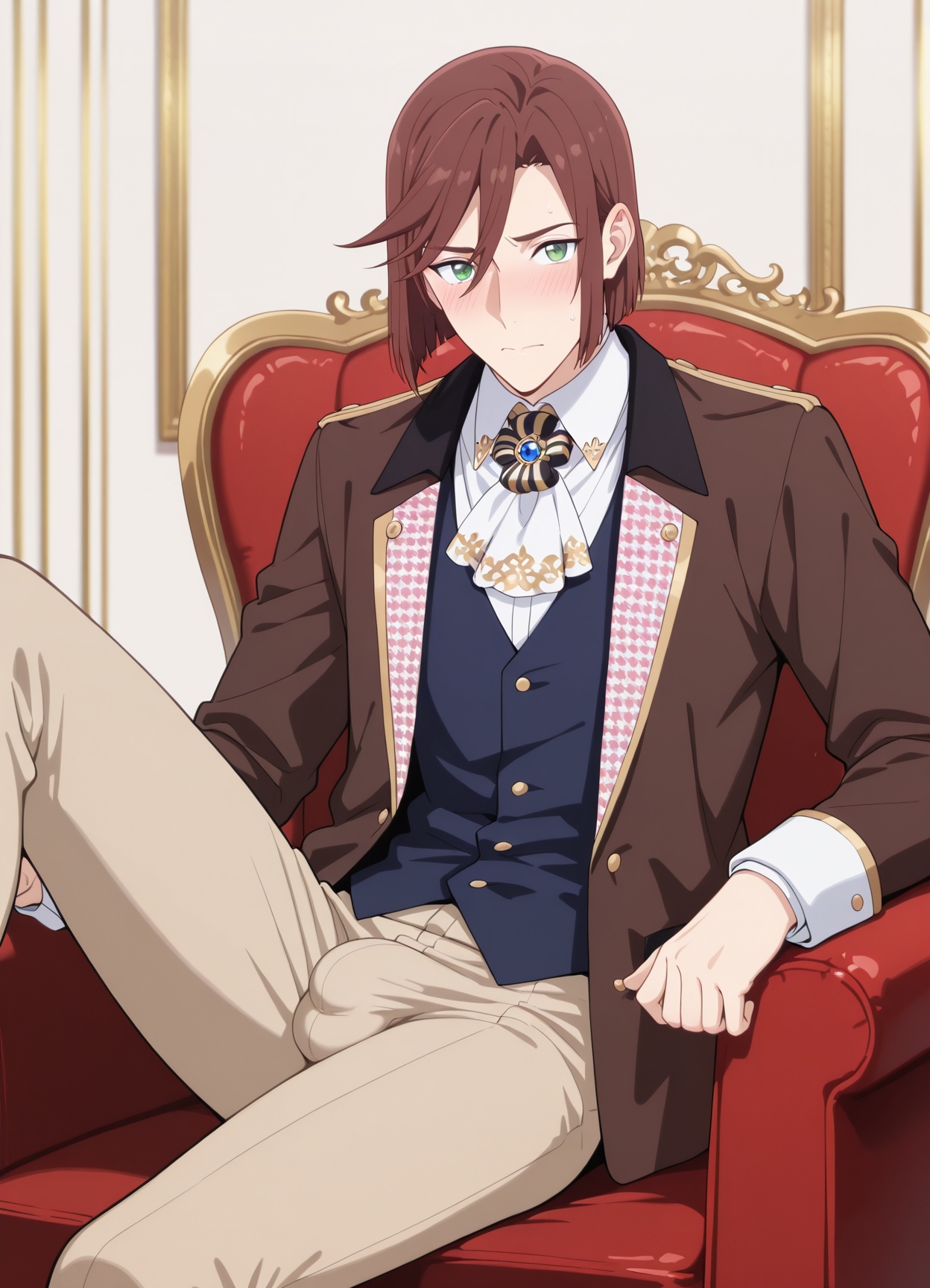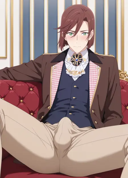 Other outfit: aristocratic uniform,brown blazer,gold trim,pink-and-white houndstooth pattern,blue vest,white shirt,ornamental ribbon tie,blue jewel and silver brooch,light brown pants,