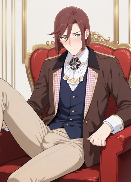 其他服装:贵族制服,棕色双排扣西装,金色镶边,粉白相间的格子图案,蓝色背心,白色衬衫,装饰性丝带领结,蓝色宝石与银色胸针,浅棕色长裤,