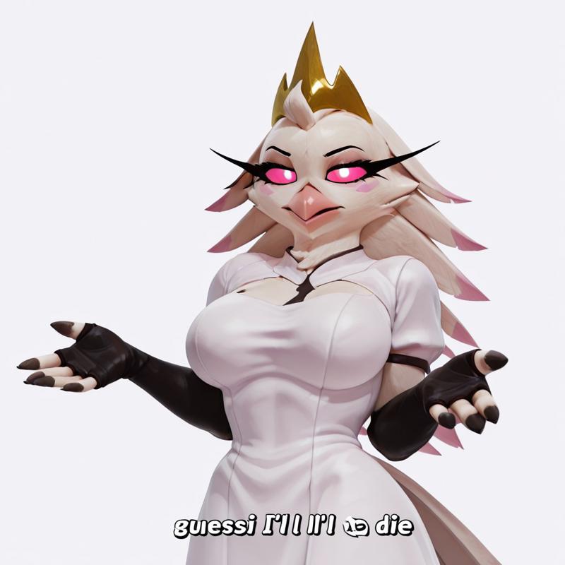 Stolas's Hateful loud wife herself A lot of people hate her but I personally don't mind her She is a asshole don't get me wrong Lol This Was trained using public Images based on valorlynz's 3d model I always found that some Vizziepop Characters don't transition well into 3d without having to significantly alter their designs Take a look at some fan made Stolas models for example But this one's pretty nice Can be used to make 2d and 3d art of her If you want 2d but 3d in backlist and put 2d in prompt