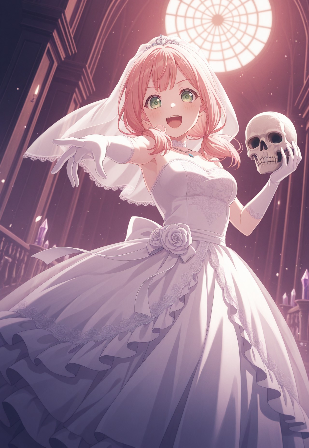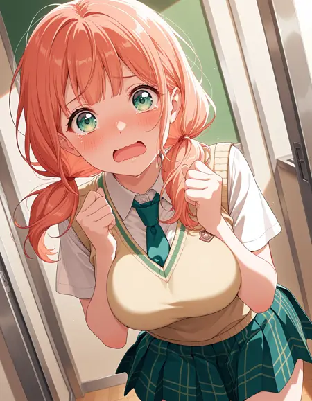 hmr_uehr, pink hair, long hair, green eyes, large breasts