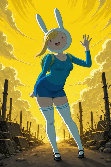 fionna_campbell,._.,无鼻子,绿色背包,兔头套,动物头套,白色头套,金发,长刘海,不对称刘海,扫刘海,蓝袖,长袖,蓝裙,铅笔裙,白色及膝袜,玛丽珍鞋,黑色鞋履