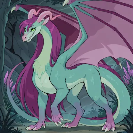 dragon female, quadruped, cyan scales, light green neck, light green face, pink nose, pink curled horns, purple wings with lavender membrane, dragon wings, long straight purple hair, long tail with purple tip, green sclera, black eyes, lavender toes with white claws,