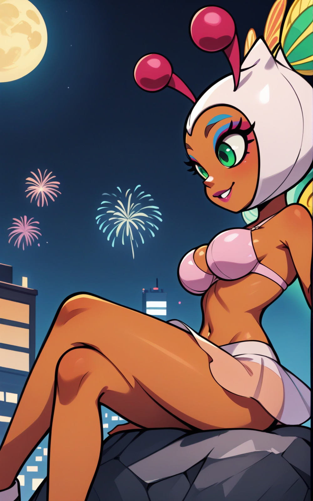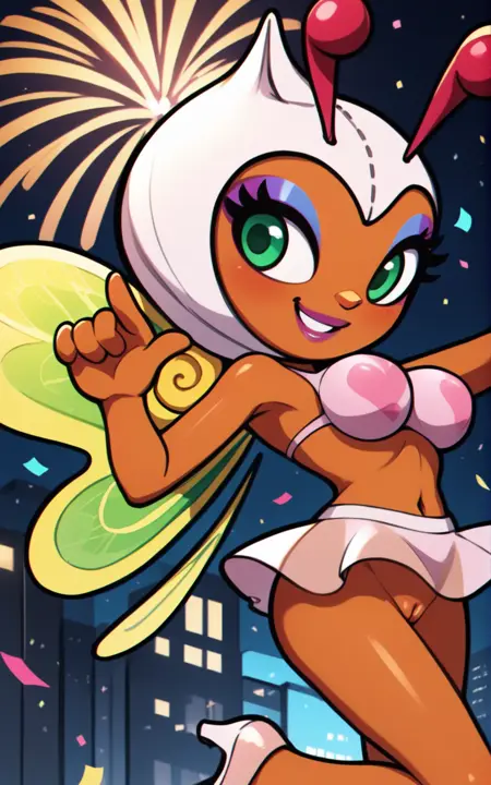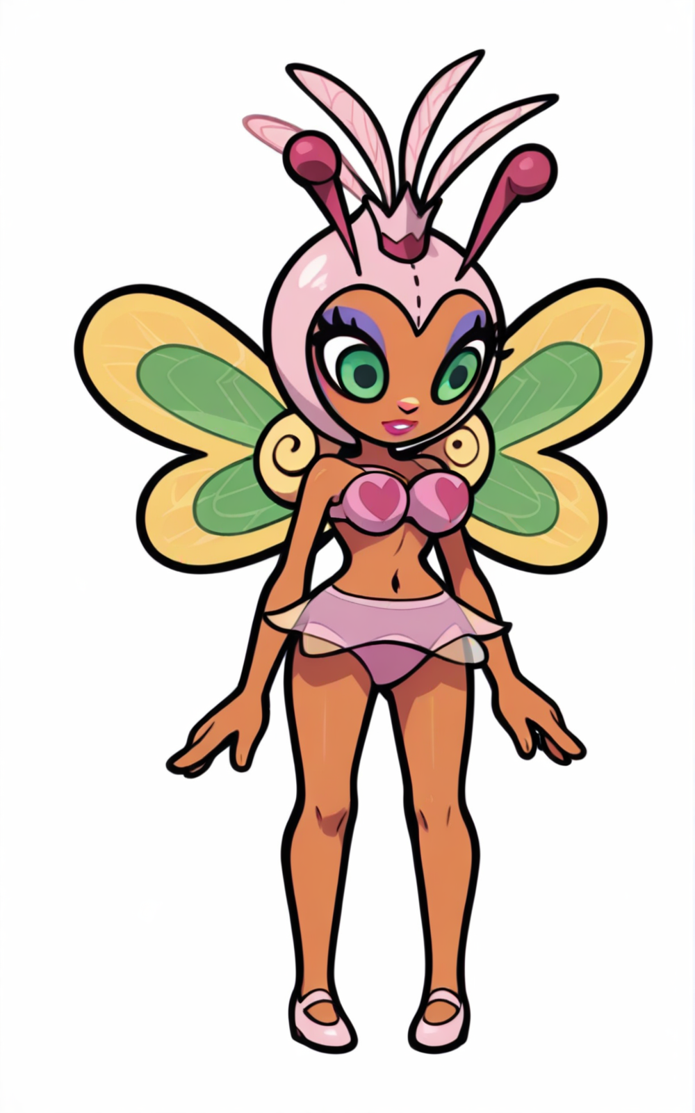 強化タグ: 翼、昆虫の翼、触角、緑の目、オレンジ色の肌、黒い肌、黒人女性、化粧、節足動物の女の子