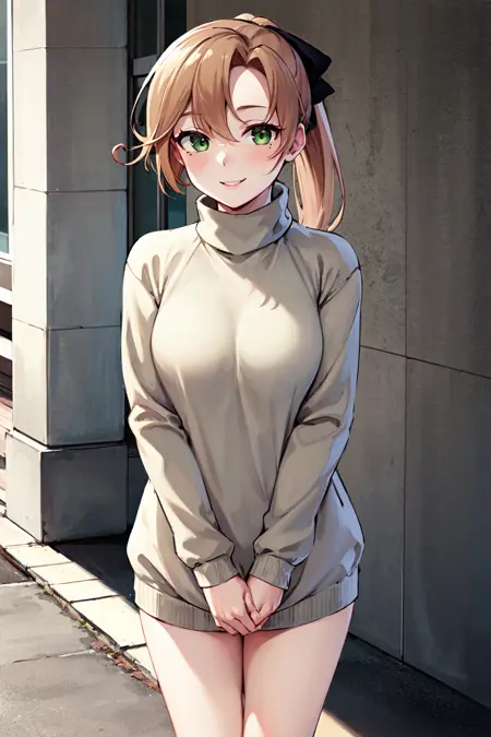 - ccakigumo、茶色の髪、長い髪、ポニーテール、髪リボン、緑の目、(目の下のほくろ:0.7)、(緑のセーター:1.4)、黒いリボン、長袖、(長いスカート:1.2)、(オレンジのスカート:1.2)、白いソックス、ハイヒール