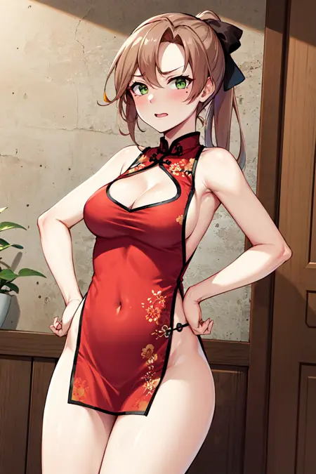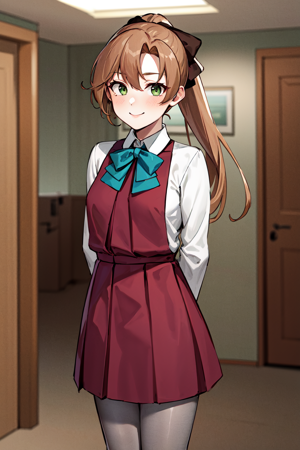 - aaakigumo、緑の目、茶色の髪、長い髪、ポニーテール、髪リボン、(目の下のほくろ:0.7)、(プリーツスカート:1.4)、(赤いドレス:1.2)、アクア色のネクタイ、白いシャツ、長袖、スカート、グレーのタイツ、ブーツ