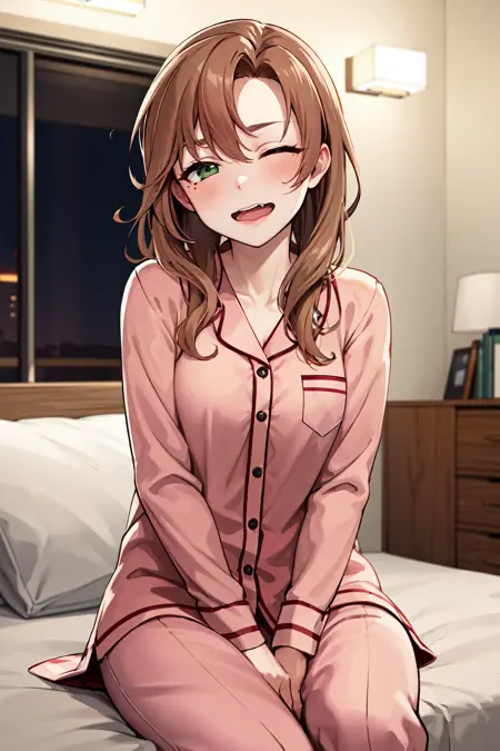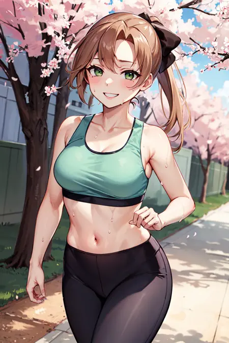 • ccakigumo, 갈색 머리, 긴 머리, 토끼꼬리, 머리리본, 녹색 눈, (눈 밑 점:0.7), (녹색 스웨터:1.4), 검은 리본, 긴 소매, (긴 치마:1.2), (주황색 치마:1.2), 흰 양말, 하이힐