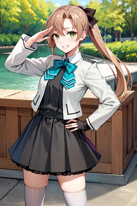 - bbakigumo、茶色の髪、長い髪、ポニーテール、髪リボン、緑の目、(目の下のほくろ:0.7)、アクア色のネクタイ、ジャケット、ドレス、長袖、指なし手袋、(黒いスカート:1.2)、グレーのハイソックス、ブーツ
