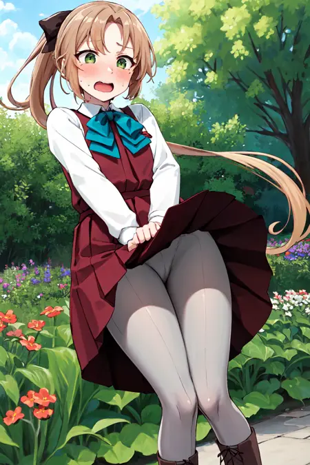 • aaakigumo, 녹색 눈, 갈색 머리, 긴 머리, 토끼꼬리, 머리리본, (눈 밑 점:0.7), (주름치마:1.4), (빨간 드레스:1.2), 아쿠아 활매듭, 흰 셔츠, 긴 소매, 치마, 회색 팬티스타킹, 부츠