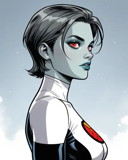 トリガー: deadgrl, 色付きの肌, 灰色の髪, 短い髪, 赤い目, ボディスーツ, ベルト,