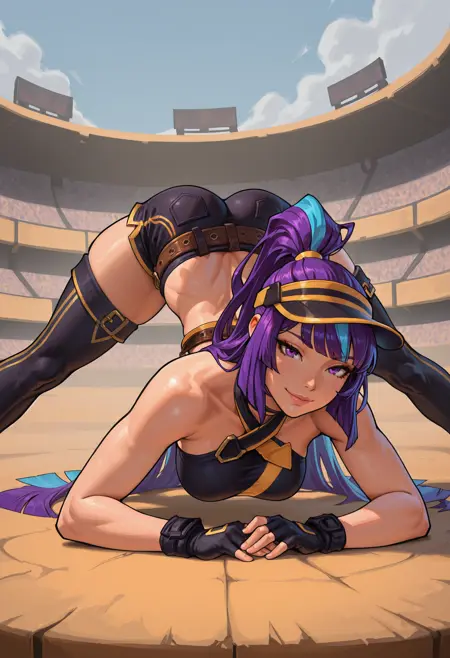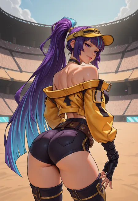 sfireliail, medium breasts, (thick thighs:0.9), purple eyes, blunt ends, long hair, very long hair, blue hair, purple hair, ponytail, multicolored hair, two-tone hair, lips, long sleeves, black gloves, visor cap, thighhighs, navel, bare shoulders, yellow jacket, black gloves, choker, belt, midriff, fingerless gloves, open jacket, off shoulder, crop top, halterneck, shorts, belt buckle,