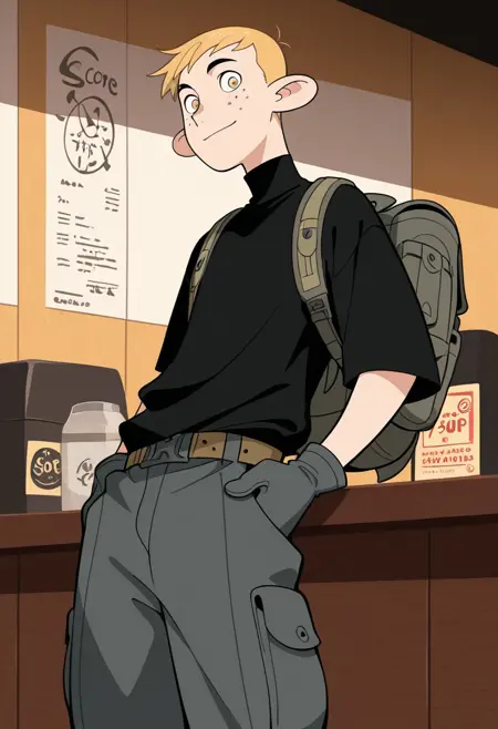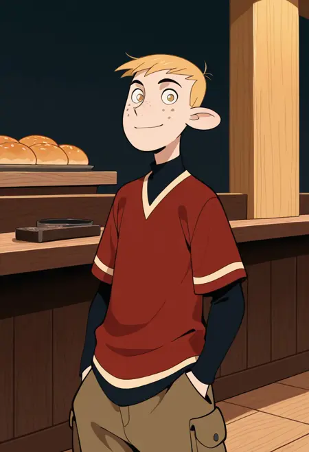 Ron, 1boy, male, blonde hair, black eyebrows, dark yellow eyes, round ears, freckles, red shirt, dark blue sleeves, brown cargo pants, white sneakers,