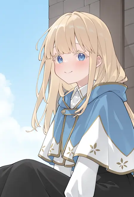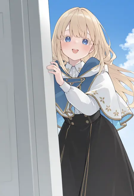 multicolored capelet, hooded capelet, two-tone capelet, blue capelet, white capelet, gold trim, white shirt, long sleeves, collared shirt, black skirt, long skirt,