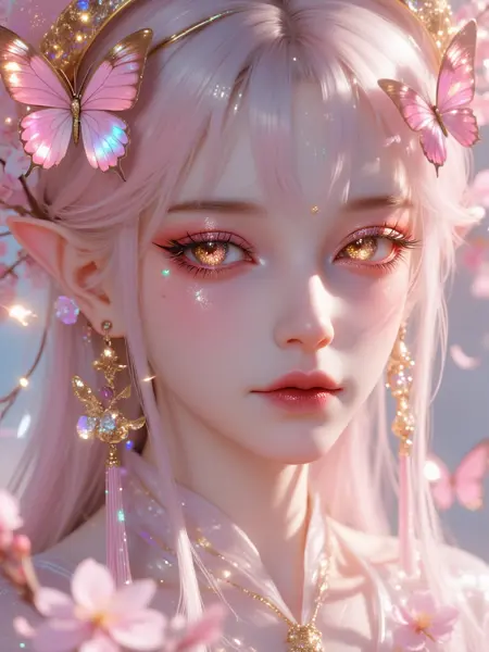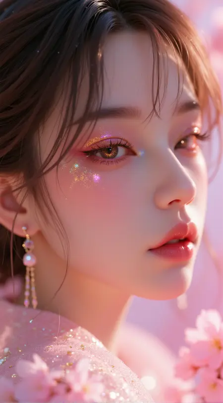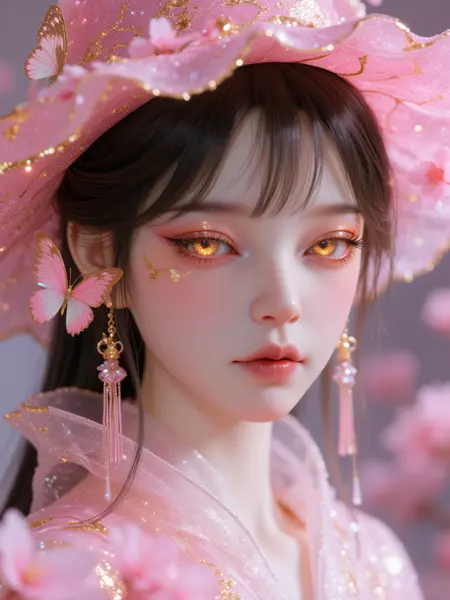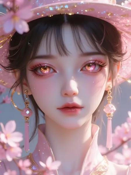 适合生成金粉色系唯美风格的女孩,2.8D国漫风格,冷白皮,有璀璨的眼眸。