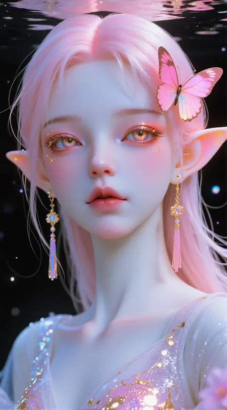 girl swims underwater,White clothes,hyper detailed render style,glow,pink,blue,brush,surreal oil painting,shiny eyes,head closeup,exaggerated perspective,tyndall of holographic,water iridescence,background black,Exquisite facial features,