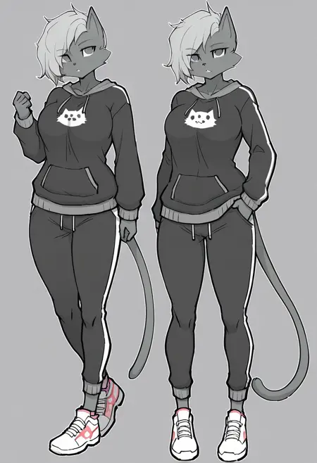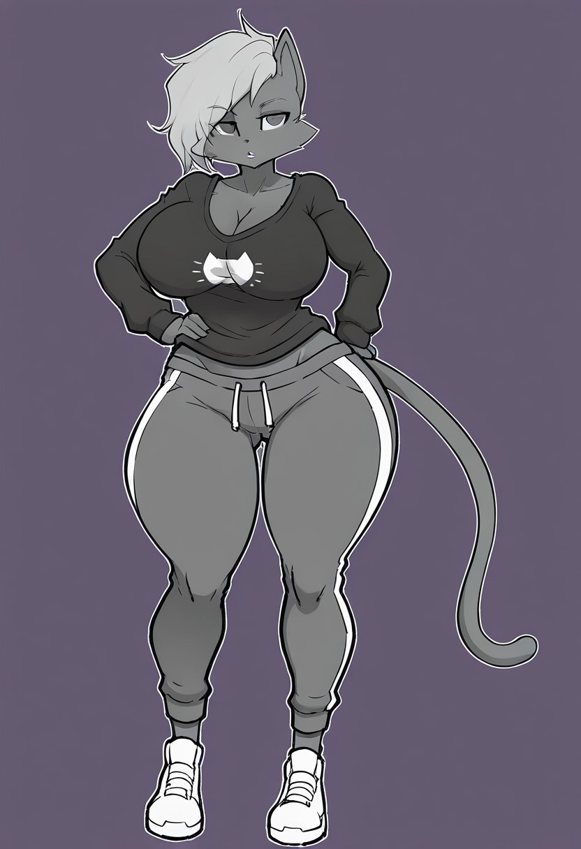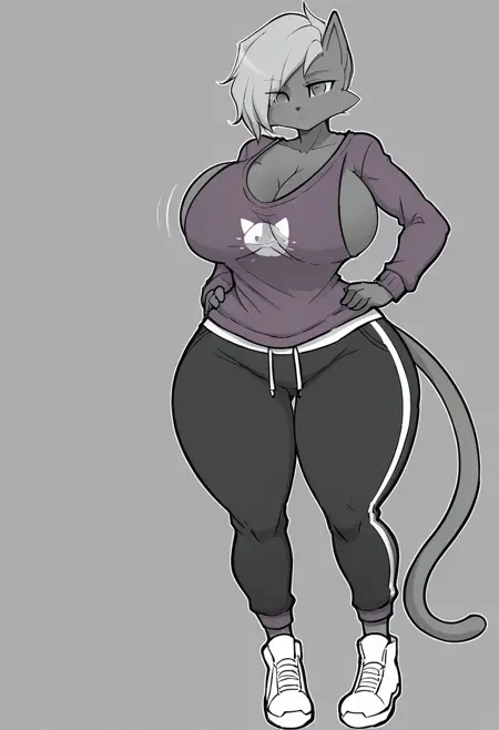 Tasha (Hayakain), Hayakain, cat girl, furry female, slim female, grey fur, light grey hair, cat tail, grey eyes, cat ears, big breasts, wide hips, thick thighs