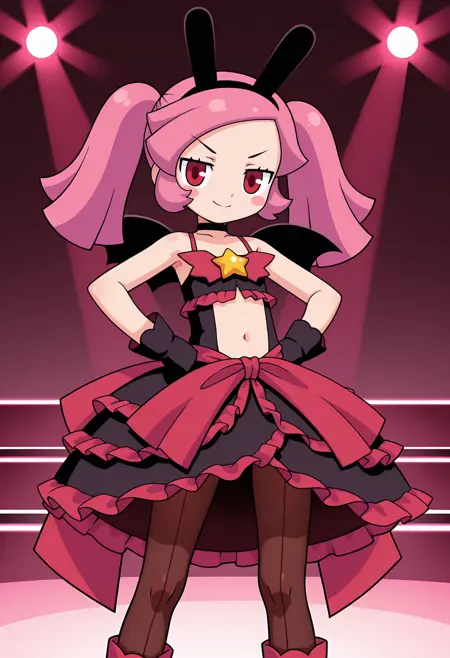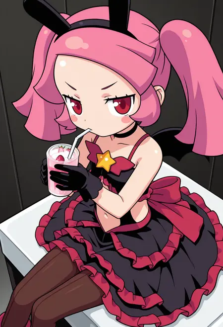 twintails, black hairband, rabbit ears, fake animal ears, sleeveless dress, black dress, layered dress, black choker, star brooch, stomach cutout, red trim, frills, red ribbon, dress ribbon, black gloves, brown pantyhose, seamed legwear, bat wings,