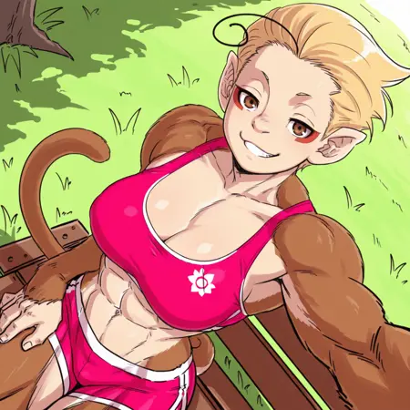 Positive Prompts: TamaFO, furry female, anthro, primate, monkey girl, pointy ears, short hair, loose hair strand, eye markings, short eyebrows, monkey tail, medium tail, medium breasts