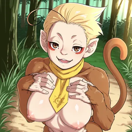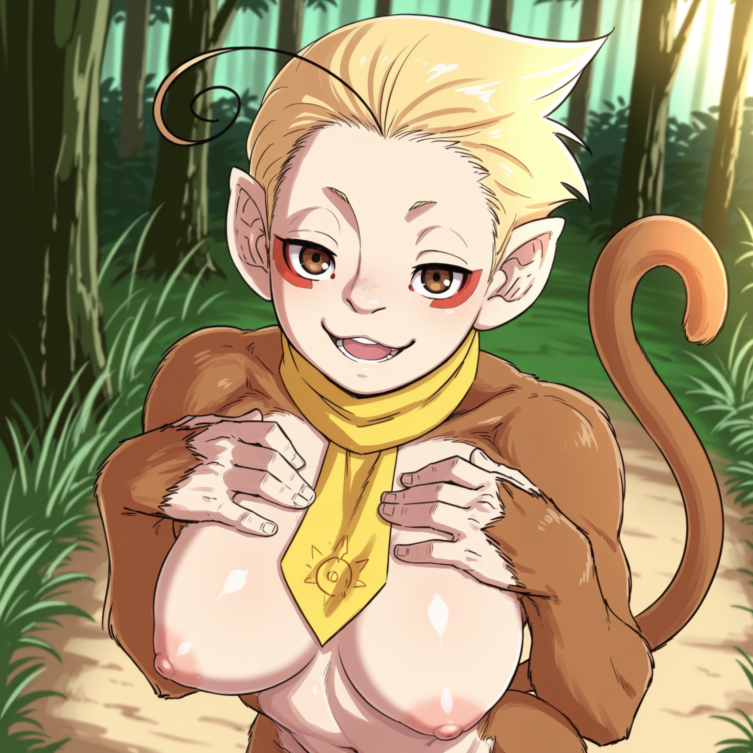 If you want her in color, then put this: furry female, anthro, primate, monkey girl, pointy ears, blonde hair, blonde loose hair strand, short hair, red eye markings, brown eyes, brown fur, two tone body, brown monkey tail, medium tail, medium breasts, yellow neckwear, yellow scarf, yellow tie