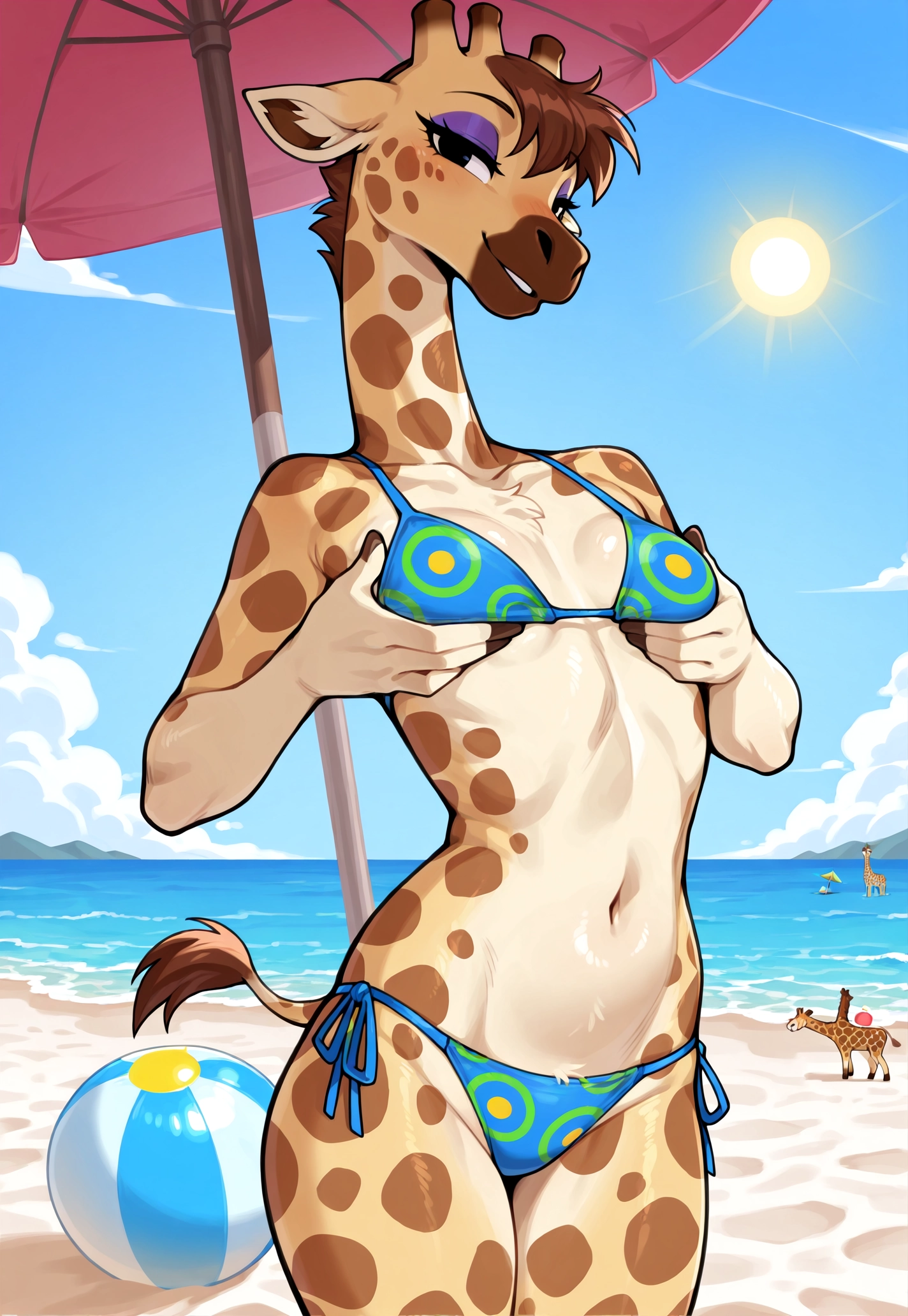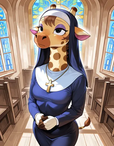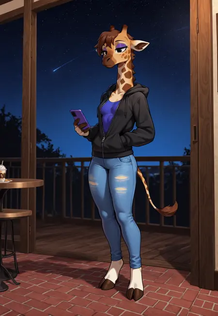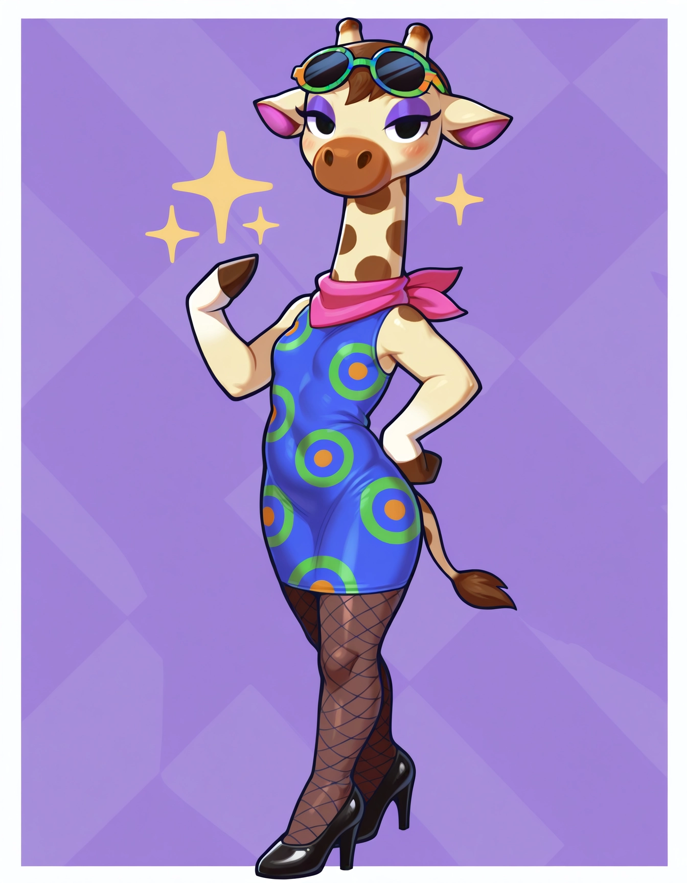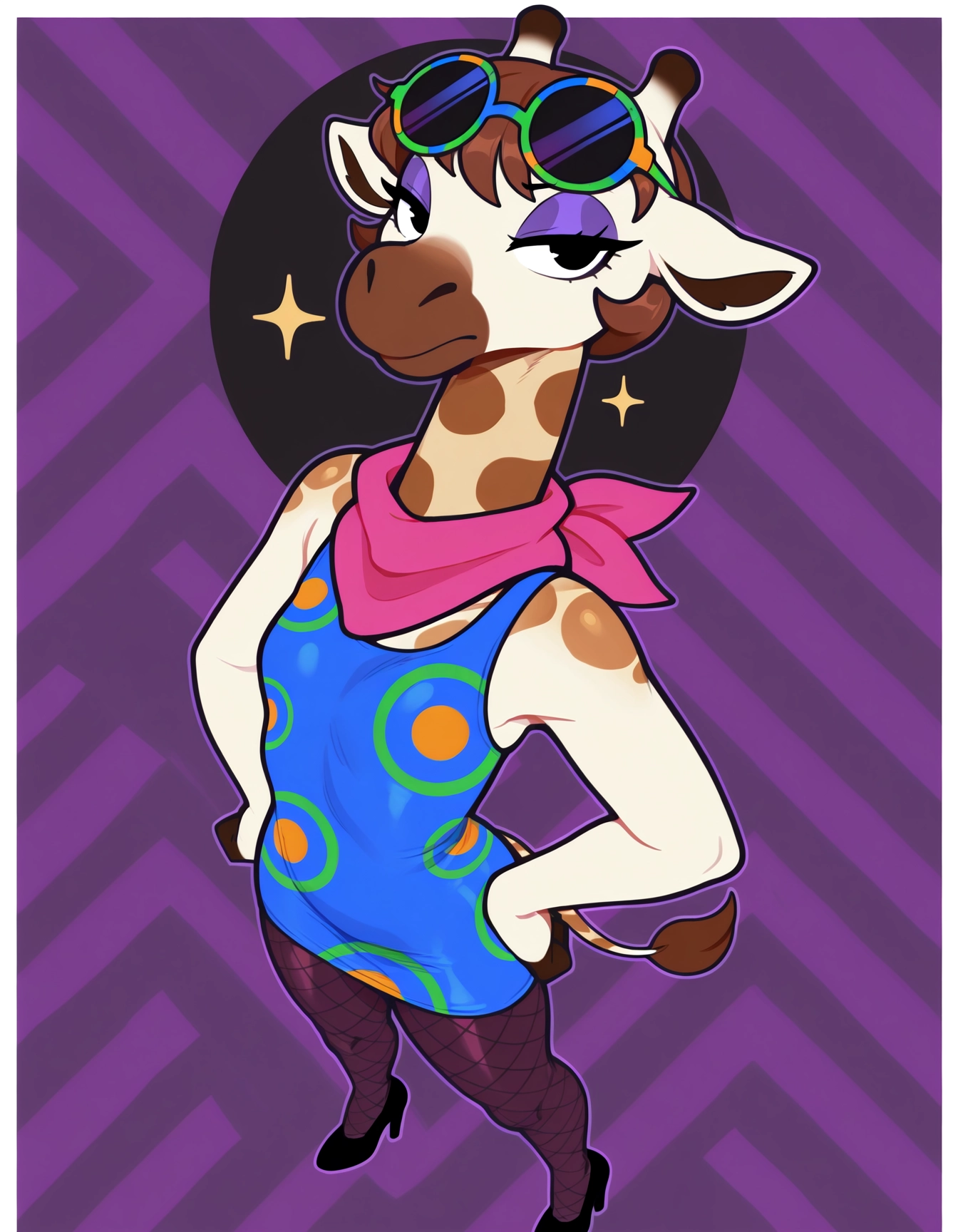 Gr4cieAC, 1girl, anthro giraffe, anthro, furry female, anthro female, Furry, black eyes, tail, giraffe horns, small breasts, flat chest, brown hair, short hair, purple eyeshadow, pink scarf, blue shirt, sleeveless, sleeveless dress, patterned dress, patterned shirt, fancy glasses, sunglasses, colored sunglasses, multicolor eyewear, eyewear on head, fishnet tights, fishnets, black high heels,