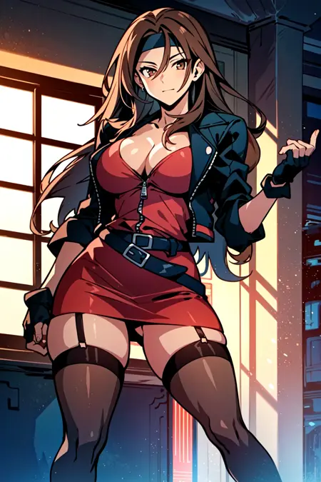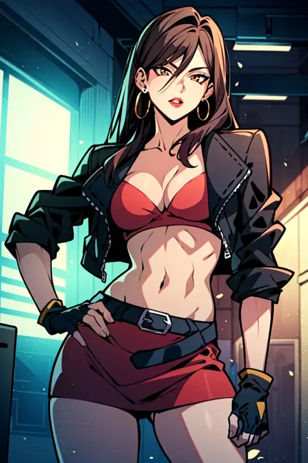 Blaze Fielding, 1girl, solo, hoop earrings, gloves, jewelry, breasts, earrings, jacket, cropped jacket, brown hair, fingerless gloves, cleavage, black gloves, makeup, belt, long hair, midriff, hand on hip, black jacket, leather jacket, navel, leather, lipstick, crop top, red lips, brown eyes, medium breasts, open jacket