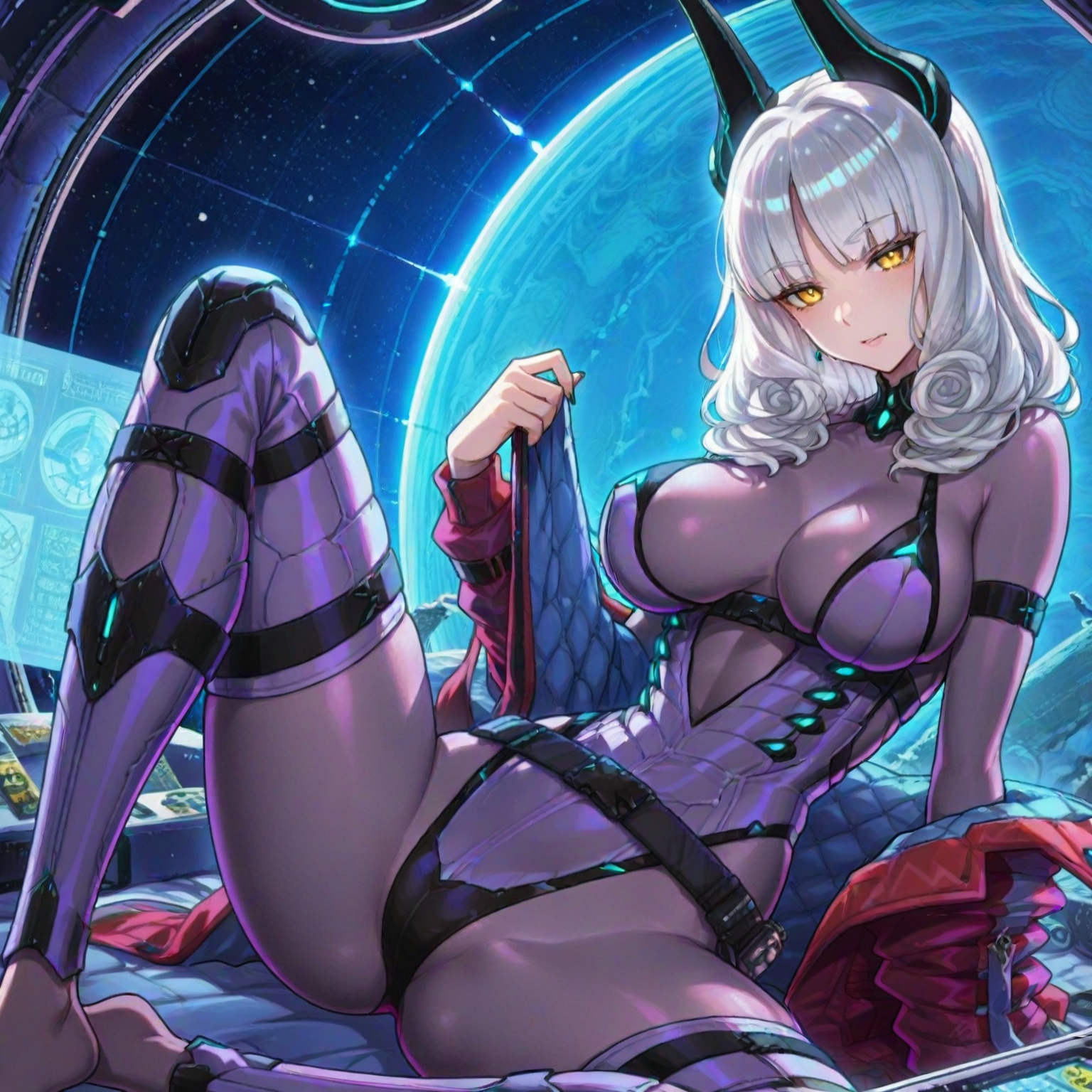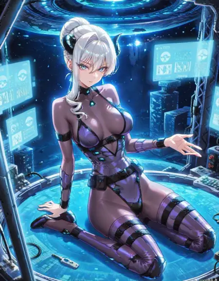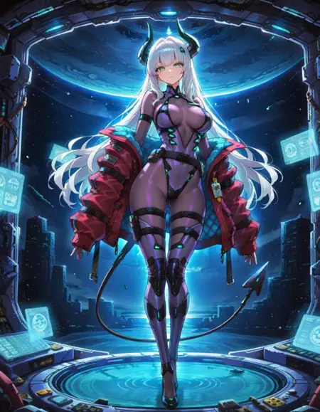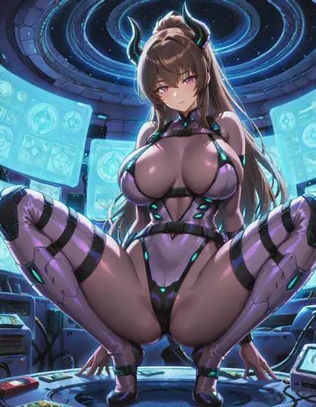 SpaceMistress,plunging neckline,purple bodysuit,black armlet,black belt, black demon horns,highleg,thigh armor,green glowing circuits,black thighhighs,skin tight inner suit,dark sheer fabric