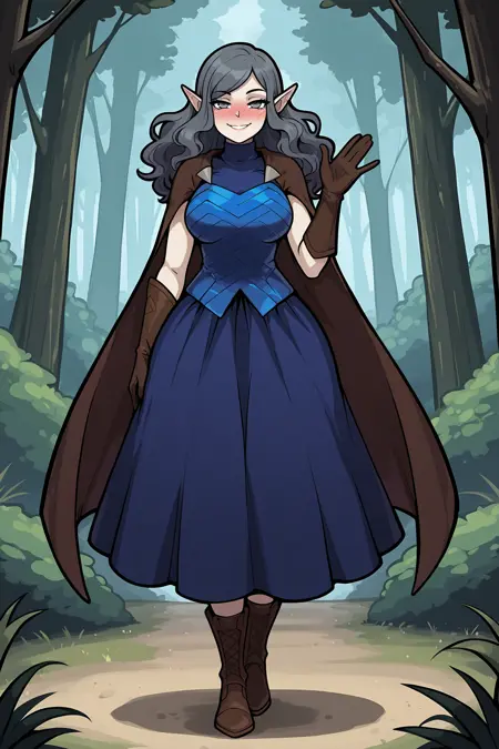 ➜ SigridWILXL, 灰色眼睛, 灰色头发, 长发, 尖耳朵, 大胸, 宽臀, 棕色斗篷, 蓝色盔甲, 蓝色连衣裙, 棕色肘套, 蓝色裙子, 棕色靴子
