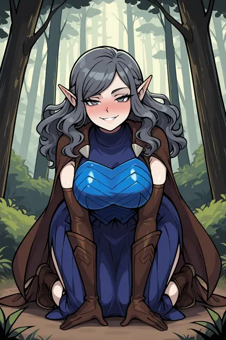 ➜ SigridWILXL, グレーアイズ, グレーの髪, 長い髪, 尖った耳, 大きな胸, 広い hips, 茶色のマント, 青い鎧, 青いドレス, 茶色の肘手袋, 青いスカート, 茶色のブーツ