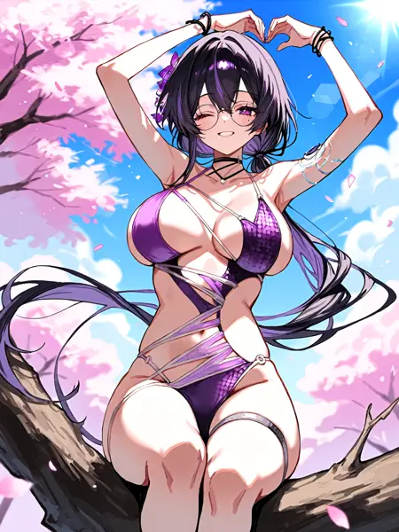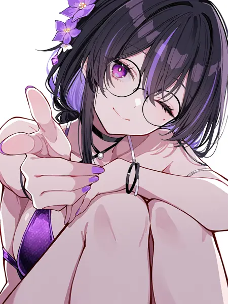 提示词:Vidya_shannon, Vidya_shannon-Celestial Swan_(Aqua Mirage), ponytail, black hair, purple hair, multicolored hair, mole under eye, purple eyes, round eyewear, purple one-piece swimsuit, wearing_eyewear,