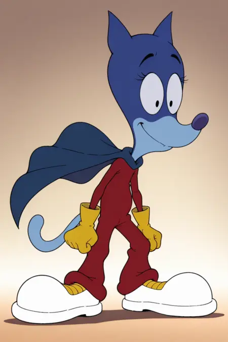 超级英雄服装:罗贝塔·伊卢斯,单独,1个女孩,拟人化狗,蓝色毛发,黑色眼睛,深蓝色鼻子,蓝色尾巴,红色面罩,红色紧身衣,黄色手套,蓝色斗篷,白色鞋子,巨大脚掌