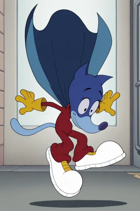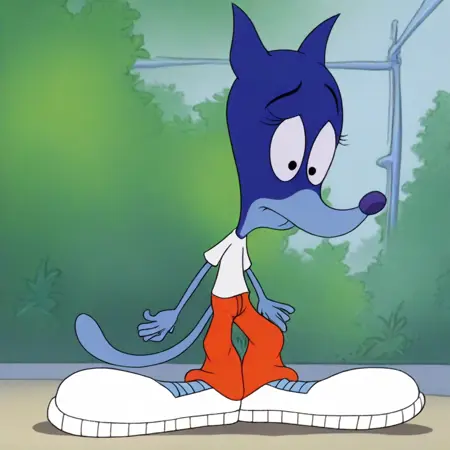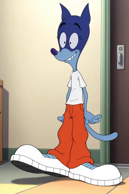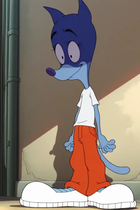 提示:罗贝塔·伊卢斯,单独,1个女孩,拟人化狗,蓝色毛发,黑色眼睛,深蓝色鼻子,蓝色尾巴,白色衬衫,橙色裤子,白色鞋子,巨大脚掌