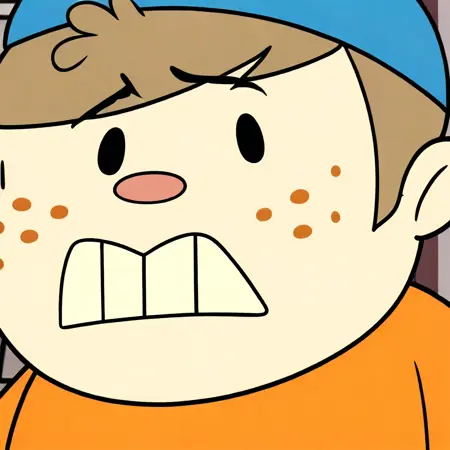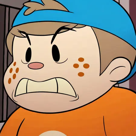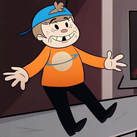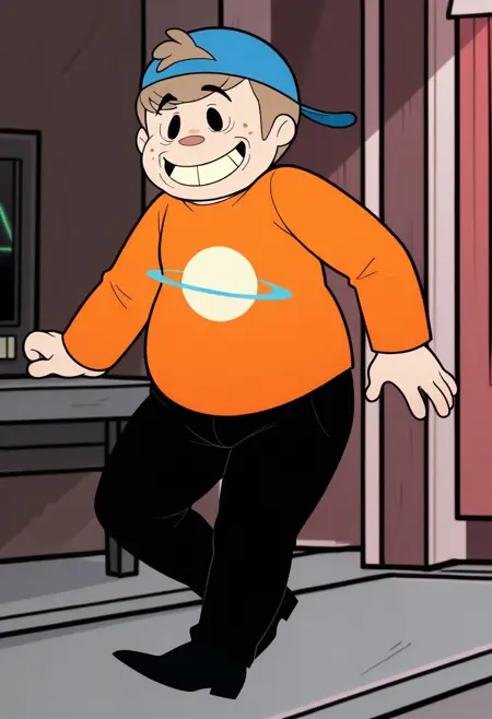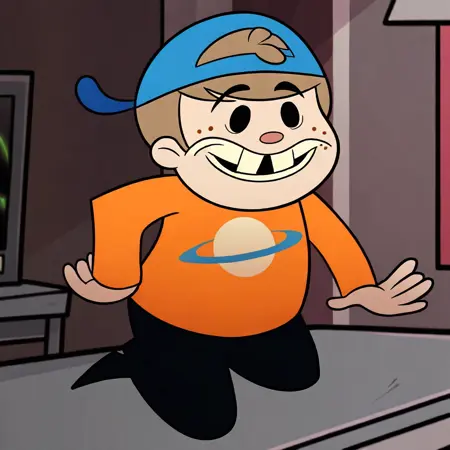 프롬프트: Eddie HB, 솔로, 1소년, 검은 점 눈, 작은 체격, 통통한, 거친 머리, 연한 갈색 머리, 두더지 자국, 윗니 하나 없는, 파란 야구 모자, 주황색 셔츠, 링 고리 행성 로고, 검은 바지, 검은 신발