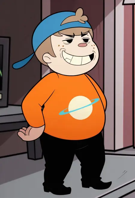 Eddie HB, solo, 1boy, black dot eyes, short size, chubby, shaggy hair, light brown hair, freckles, missing upper tooth, blue baseball cap, orange shirt, ringed planet logo, black pants, black shoes