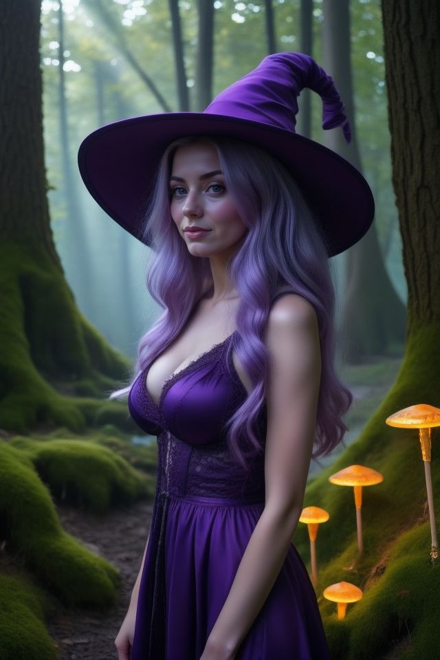 我呈现的是经过5400张高质量图片训练的迷人女巫模型,分辨率为640x960,这是一个高度多样化的模型,能够生成逼真且照片级的图像,展现优雅诱人的女性形象,身着精致内衣、现代服装,佩戴女巫帽和吸血鬼尖牙,背景为森林场景。