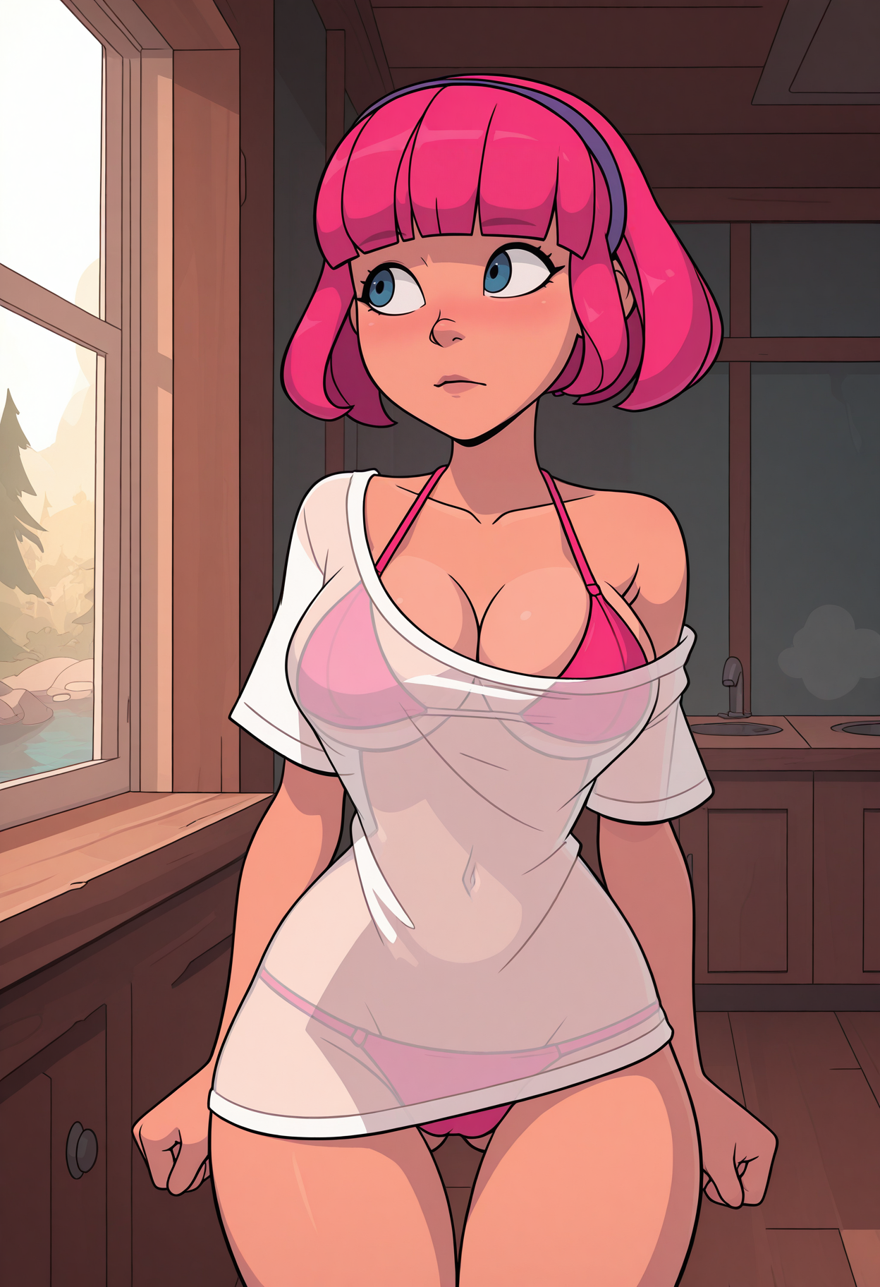 1girl, solo, blue eyes, short hair, pink hair, blunt bangs, hairband, breasts, medium breasts,