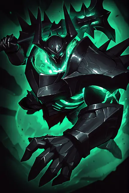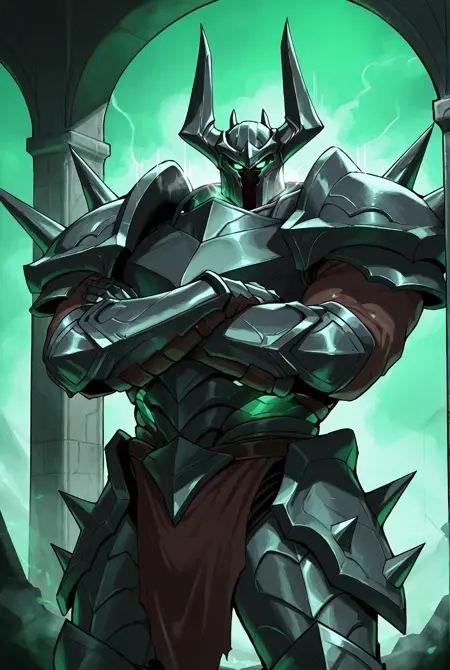 mdkser,armor, helmet, glowing eyes, horns, horned helmet, shoulder armor, full armor, gauntlets, spikes, pauldrons