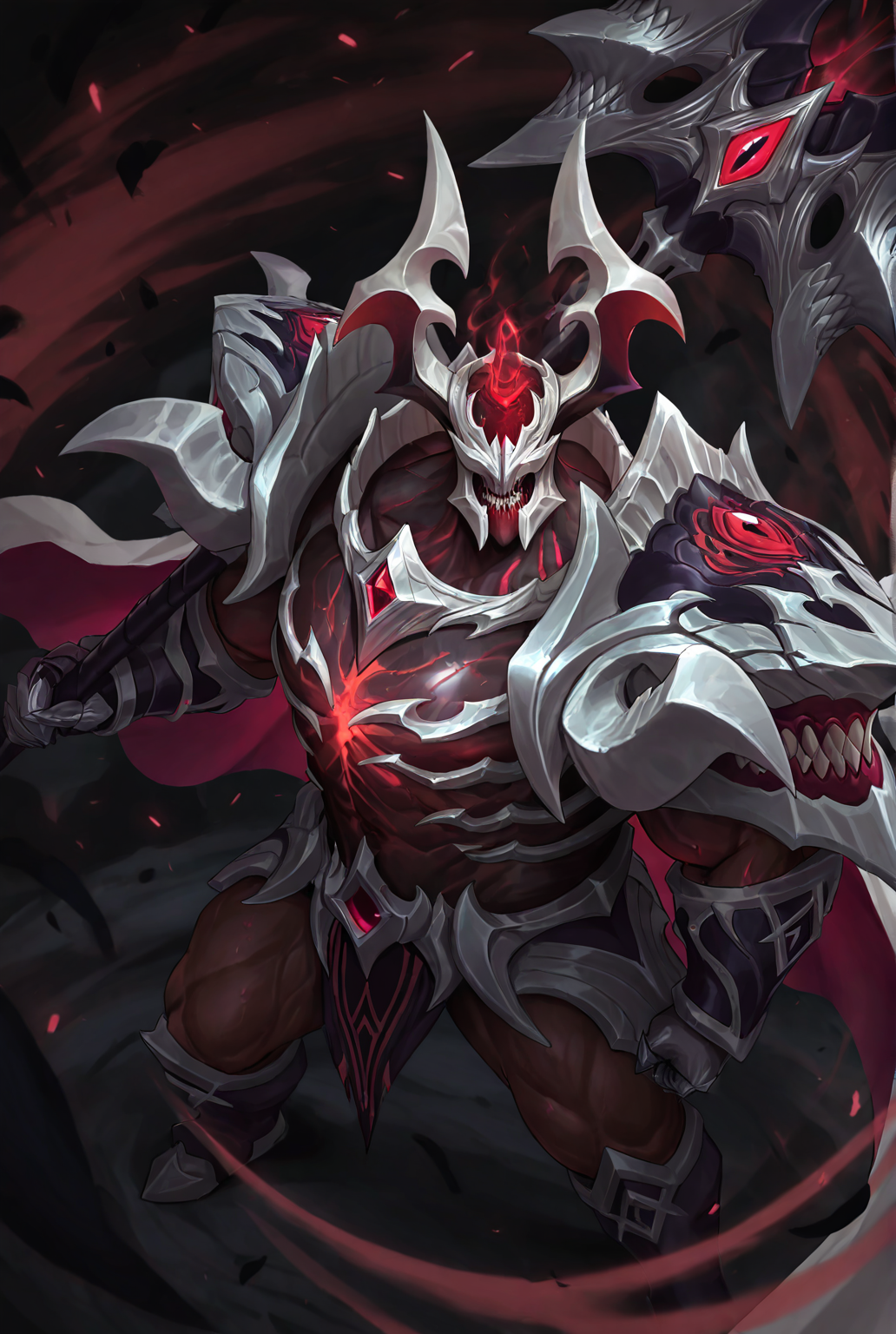 old god mdks, monster, armor, shoulder armor, helmet, glowing, horns, gauntlets, pauldrons, cape, boots