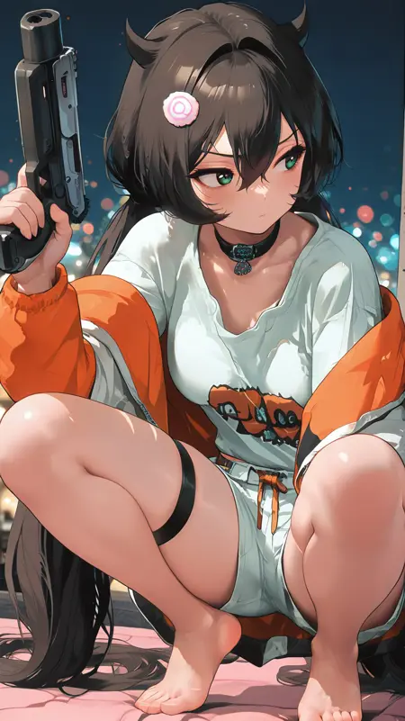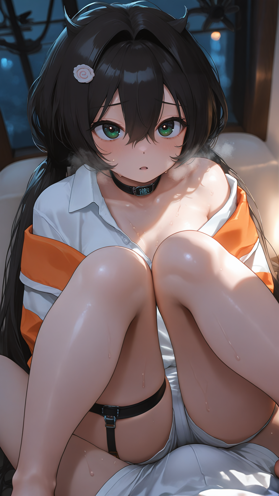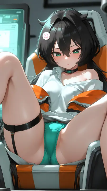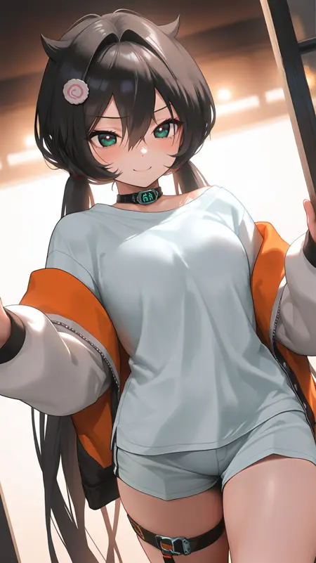 敞开的夹克,夹克,橙白夹克,项圈,大腿绑带,白衬衫,大腿,露肩,短裤,白色短裤,