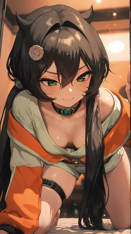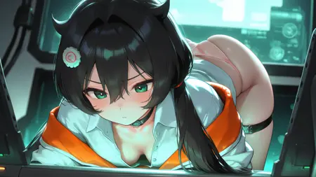 示例提示:长发,低双马尾,刘海,黑发,头发遮住眼睛,绿眼,发丝飘动,单个发饰,